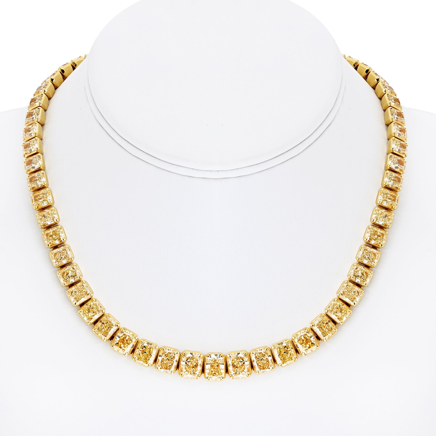 This exceptional 70.52cttw Radiant Diamond Collar Necklace is a true masterpiece, crafted in 18K yellow gold. The necklace features 60 radiant-cut diamonds, each showcasing impeccable clarity with IF, VVS, and VS grades, set in a stunning arrangement that exudes luxury. The diamonds are all natural fancy light yellow, adding a sophisticated and warm hue to this one-of-a-kind piece.
