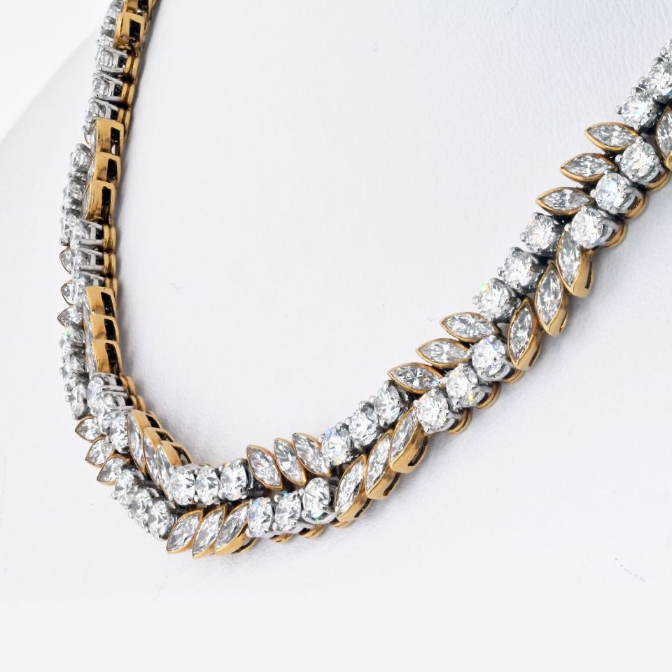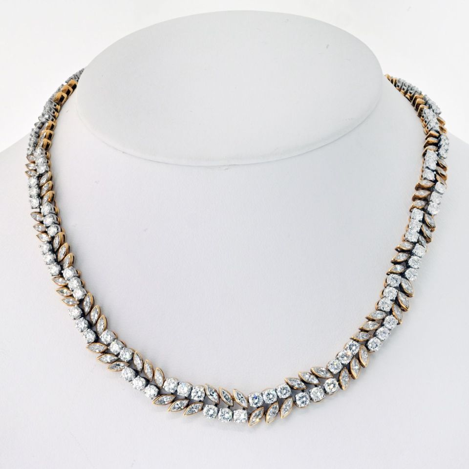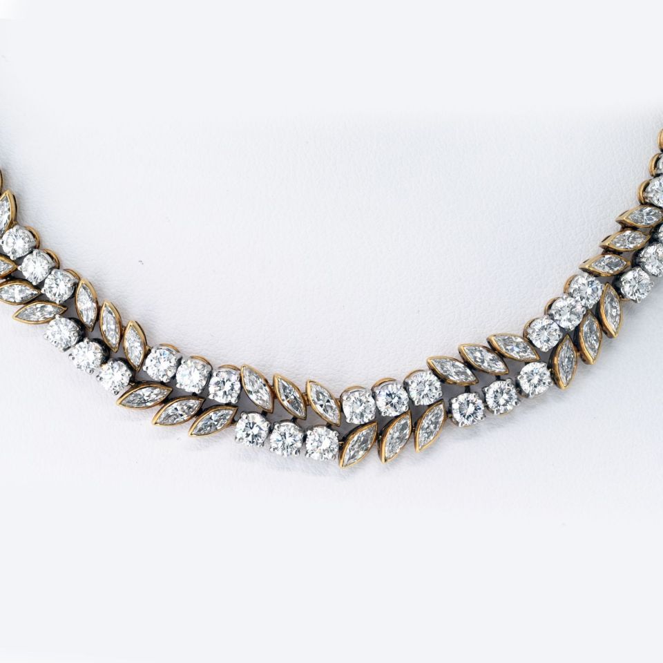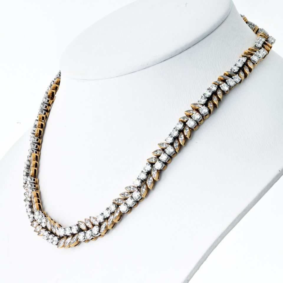French 18K Yellow Gold 32 carat MQ and Round Diamond Necklace