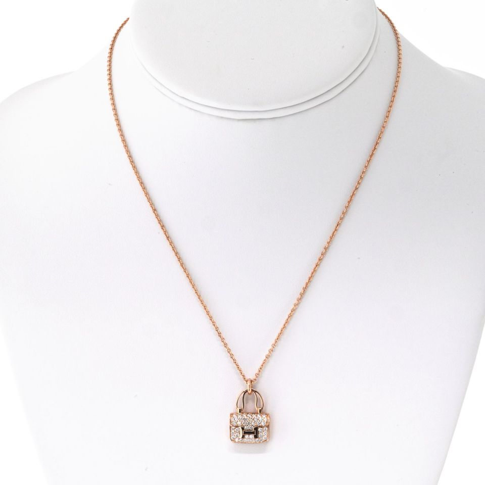 This Hermes 18k Rose Gold Amulettes Constance Pendant Necklace is a refined expression of elegance and luxury. Crafted in warm rose gold, the pendant features a stunning diamond-accented design with a signature Kelly snap closure, adding a touch of sparkle and sophistication. Measuring 0.7 inches, the motif is subtle yet striking, making it perfect for everyday wear or layering with other pieces. This necklace is in great condition and comes complete with its original box and papers, a testament to its authenticity and enduring charm. A timeless addition to any fine jewelry collection.