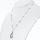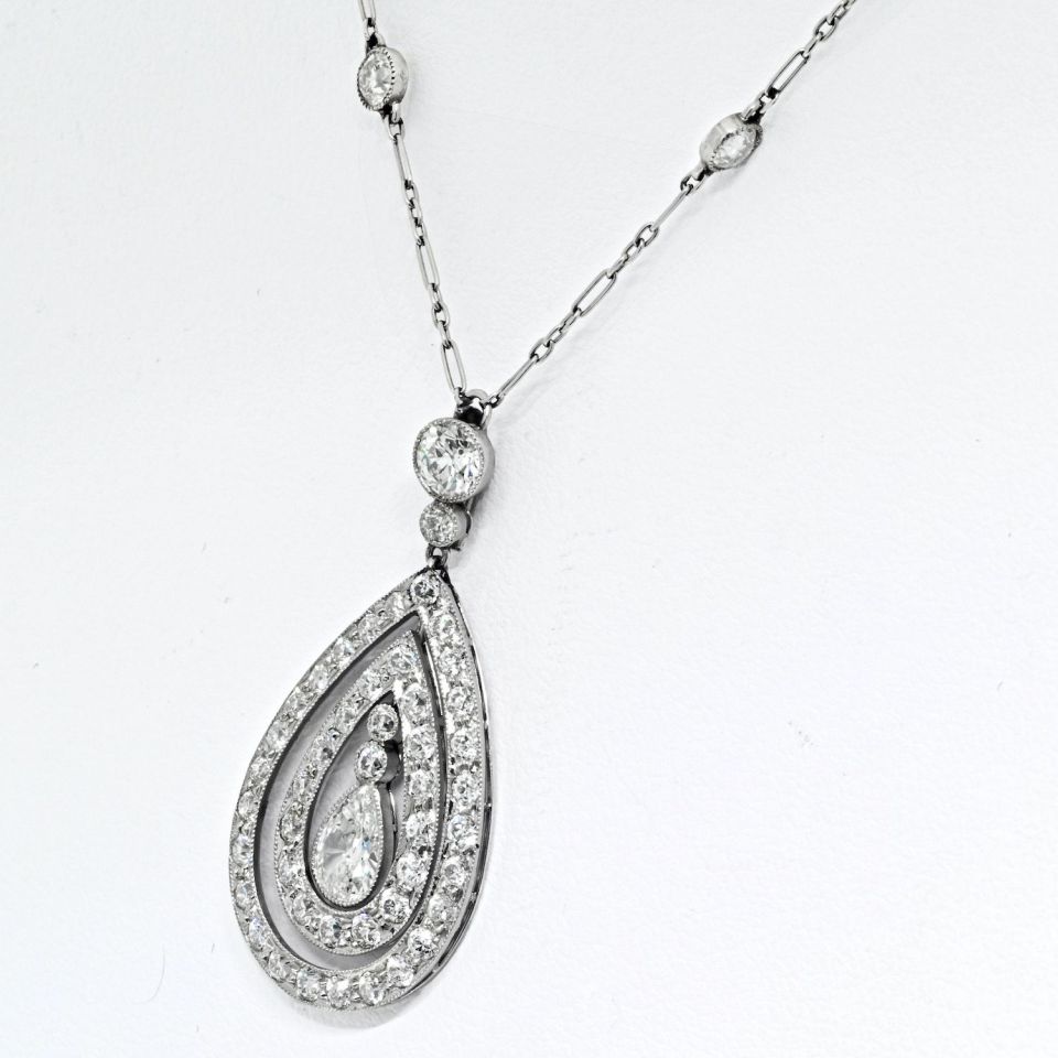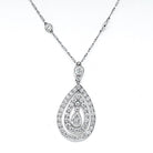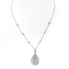 The necklace boasts a captivating pear-shaped diamond, elegantly set in an open gallery double halo setting. The intricate double halo design, adorned with brilliant diamonds, enhances the sparkle and brilliance of the central pear-shaped gem, creating a breathtaking display of light and luxury. The dangling diamond pendant adds a touch of elegance and sophistication