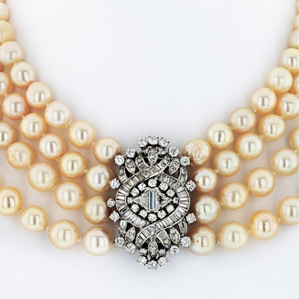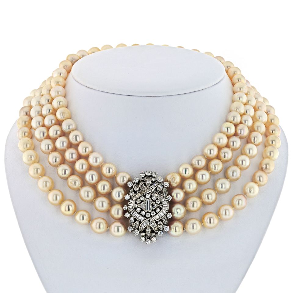 Lustrous four strings of creamy pearls and diamond clasp choker necklace. Clasp is crafted in platinum and holds approx. 8 carats of round and baguette cut diamonds.
