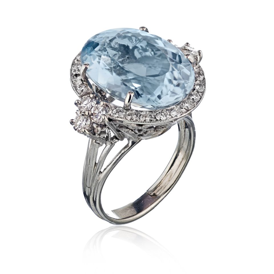 Platinum 31.47 carat Oval Aquamaring And Diamond Ring