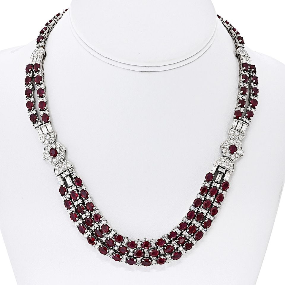 A magnificent platinum necklace designed in an Art Deco style, set with approximately 40.00 carats of fine Burmese rubies (heated), arranged in three graduating rows. Accented with brilliant and baguette-cut diamonds, weighing a total of approximately 8.40 carats, adding brilliance and contrast to the rich rubies. The piece showcases elegant geometric detailing characteristic of the Art Deco era.