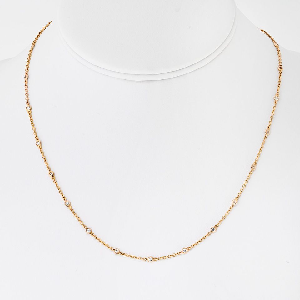 This petite Tiffany & Co. 18k Rose Gold Diamonds by the Yard Necklace is a delicate and timeless piece, perfect for adding a touch of elegance to any look. Featuring a total of 0.60 carats of sparkling round diamonds, each stone is expertly bezel-set to maximize brilliance. The soft warmth of rose gold enhances the dainty design, creating a refined and feminine aesthetic. Measuring 16 inches in length, it sits beautifully on the neckline, making it ideal for both everyday wear and special occasions. A classic piece that embodies Tiffany & Co.'s signature sophistication.