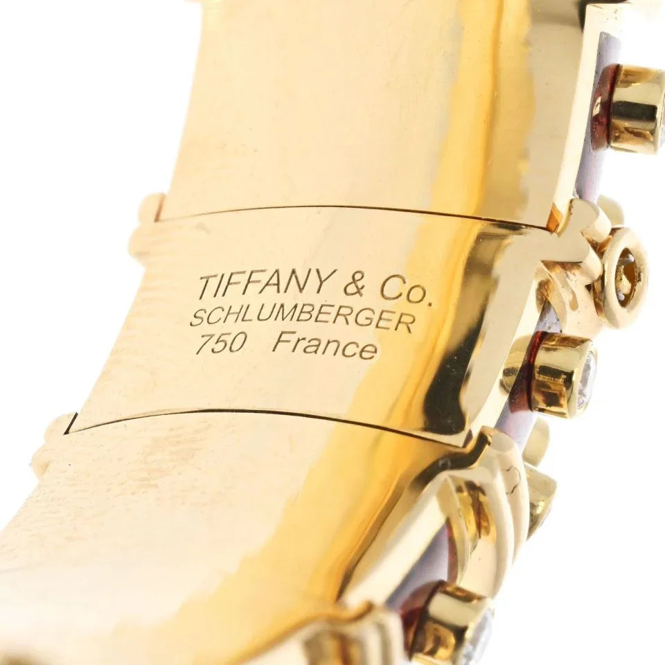 Experience the artistry of Jean Schlumberger and the timeless beauty of Tiffany & Co. with this remarkable Diamond and Red Paillonné Enamel Bangle Bracelet.