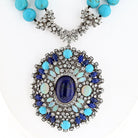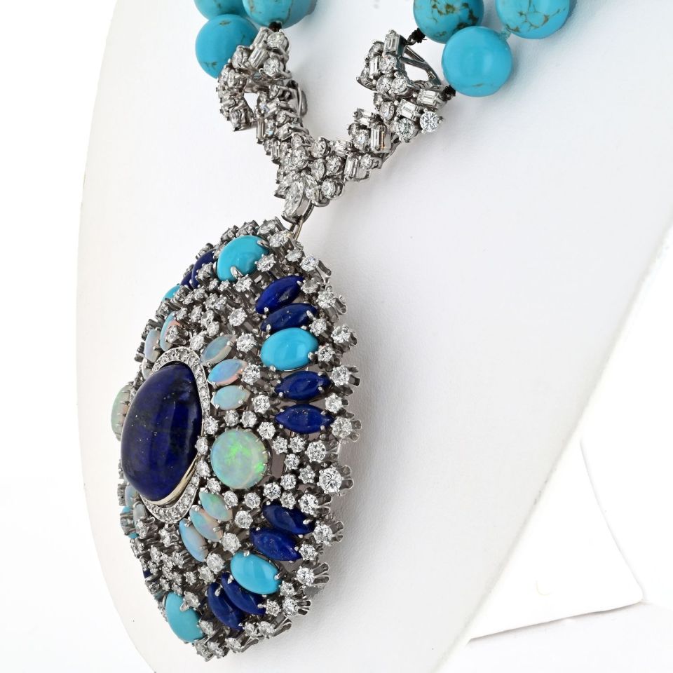 Crafted in 1970's this gypsy style necklace is everything a boho lover would want: opals, turquoise, diamonds and sapphires. The bottom part can be worn as a brooch or as a pendant.
