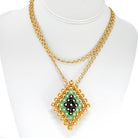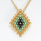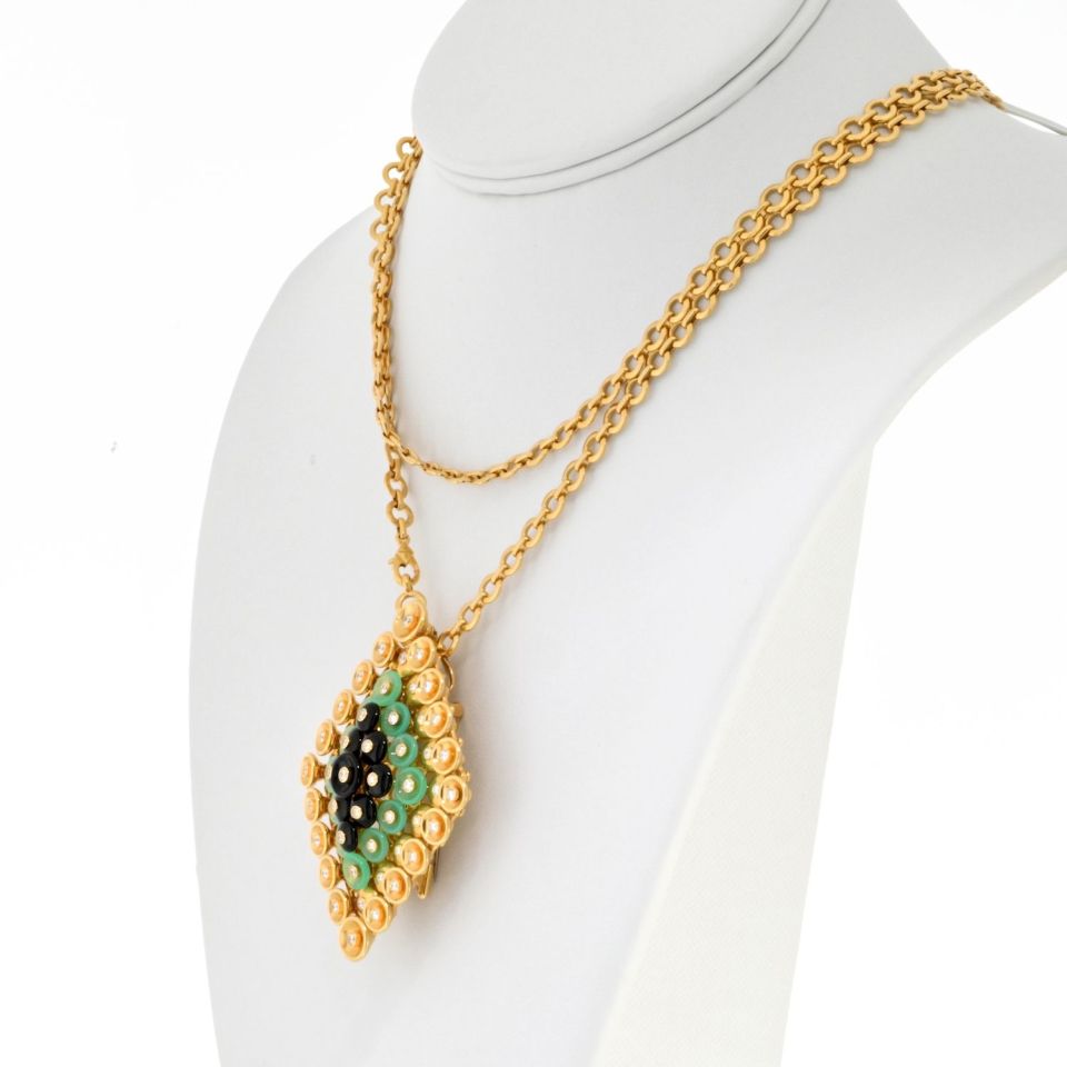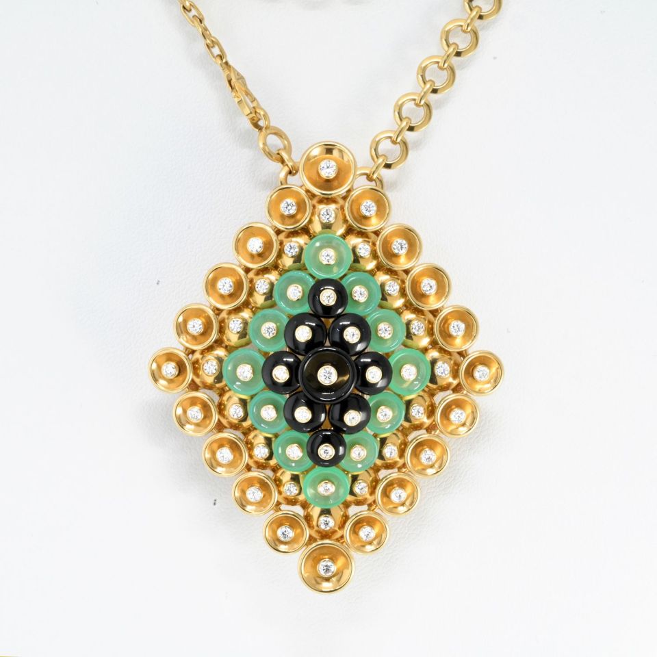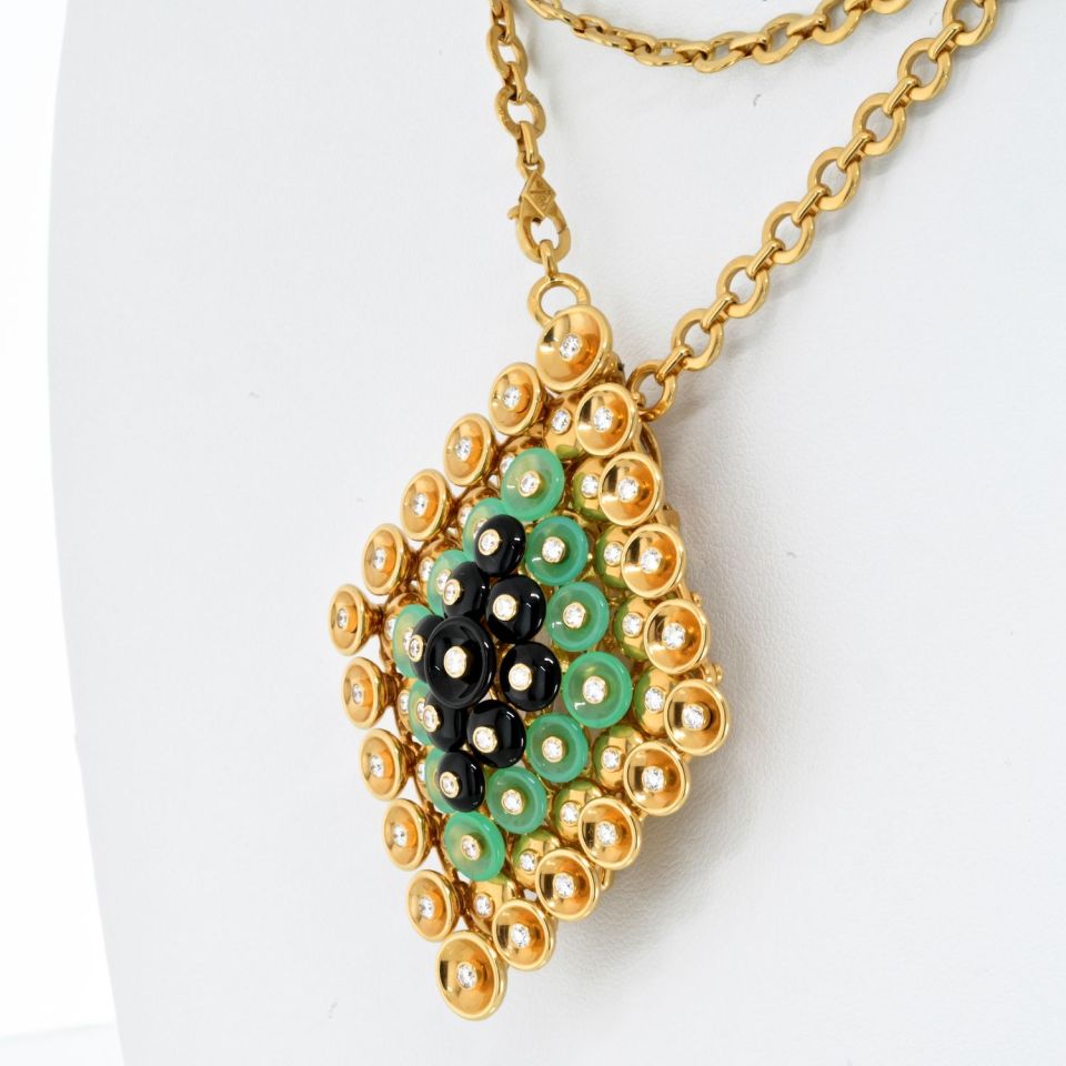 This exceptional piece features a versatile detachable pendant/clip that can be worn on the necklace or as a brooch. The pendant measures 2" x 2.5" and is crafted in 18K yellow gold, adorned with nine black onyx stones, twelve chrysoprase stones, and 57 round brilliant-cut diamonds (D-F color, IF-VVS clarity) totaling 1.46 carats. The accompanying 18K yellow gold chain measures 31.5 inches, allowing it to be worn long or doubled for a shorter style.